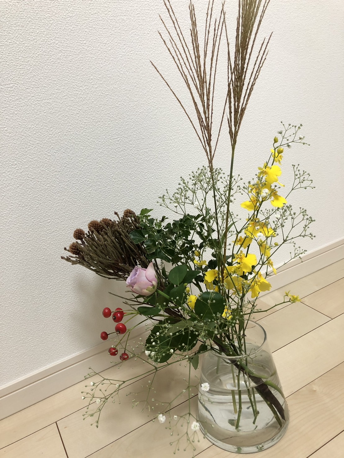バラ、オンシジューム、バラの実、ネベリア、カスミ草、ススキ